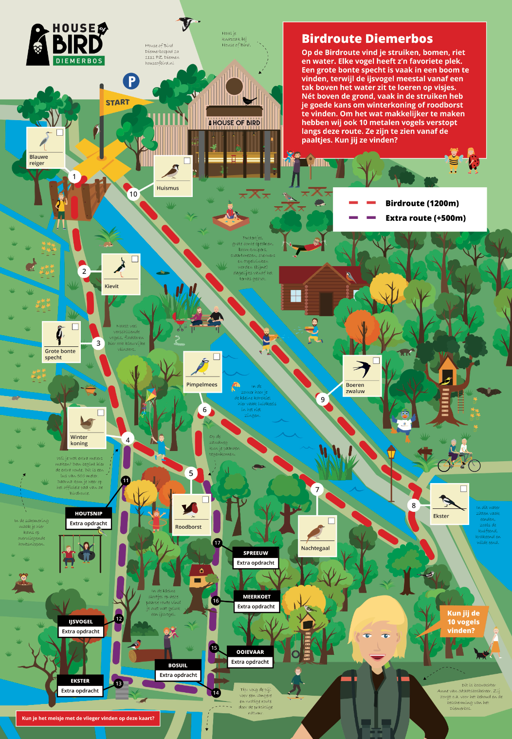 Op de Birdroute vind je struiken, bomen, riet en water. Elke vogel heeft z’n favoriete plek. Een grote bonte specht is vaak in een boom te vinden, terwijl de ijsvogel meestal vanaf een tak boven het water zit te loeren op visjes. Nét boven de grond, vaak in de struiken heb je goede kans om winterkoning of roodborst te vinden. Om het wat makkelijker te maken hebben wij ook 10 metalen vogels verstopt langs deze route. Ze zijn te zien vanaf de paaltjes. Kun jij ze vinden?